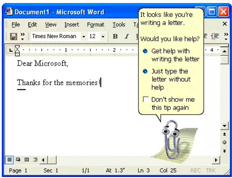 The human-like paperclip would try and guess what you were doing in each Microsoft programme, make suggestions and offer to be of service. Here’s a trip down memory lane before Clippy disappeared for good in 2007.